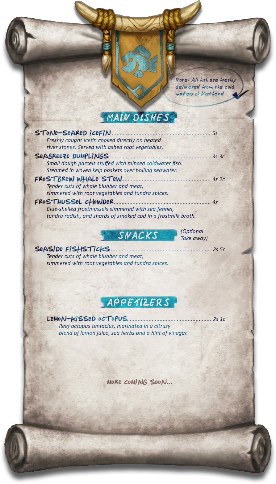 | Garlic Tideprawns & Bread | Plump Tideprawns from the coasts of Zuldazar, seared in scpiced butter. Served with crusty bread. | 4s 50c |